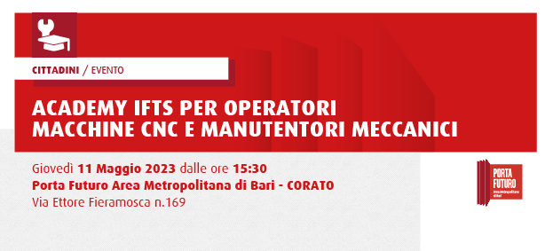 Porta Futuro Area Metropolitana di Bari su impulso di Confindustria Bari Bat - Sezione Meccanica, Elettrica ed Elettronica, in collaborazione con IFOA, Generation Italy e Lara Industry ricerca giovani periti tecnici o con la passione per la meccanica, di età inferiore a 25 anni.