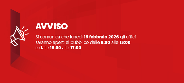Si comunica che lunedì 16 febbraio 2026 gli uffici saranno aperti al pubblico dalle 09:00 alle 13:00 e dalle 15:00 alle 17:00