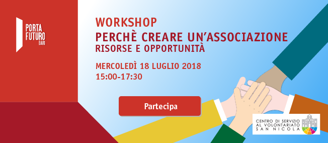 Il 18 luglio Portafuturo in collaborazione con il Centro di Servizio al Volontariato “San Nicola” organizza il workshop "Perché creare un'associazione - risorse e opportunità "